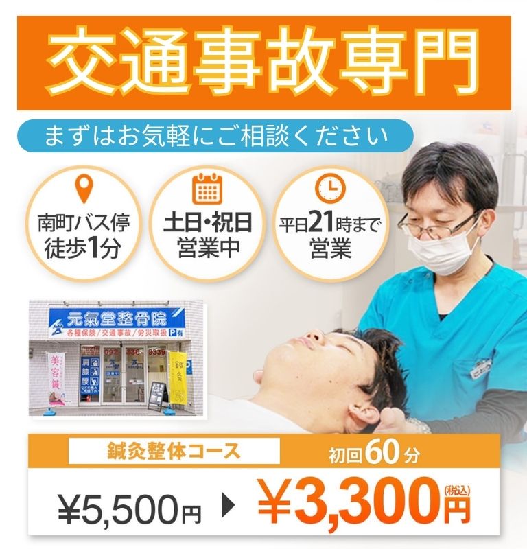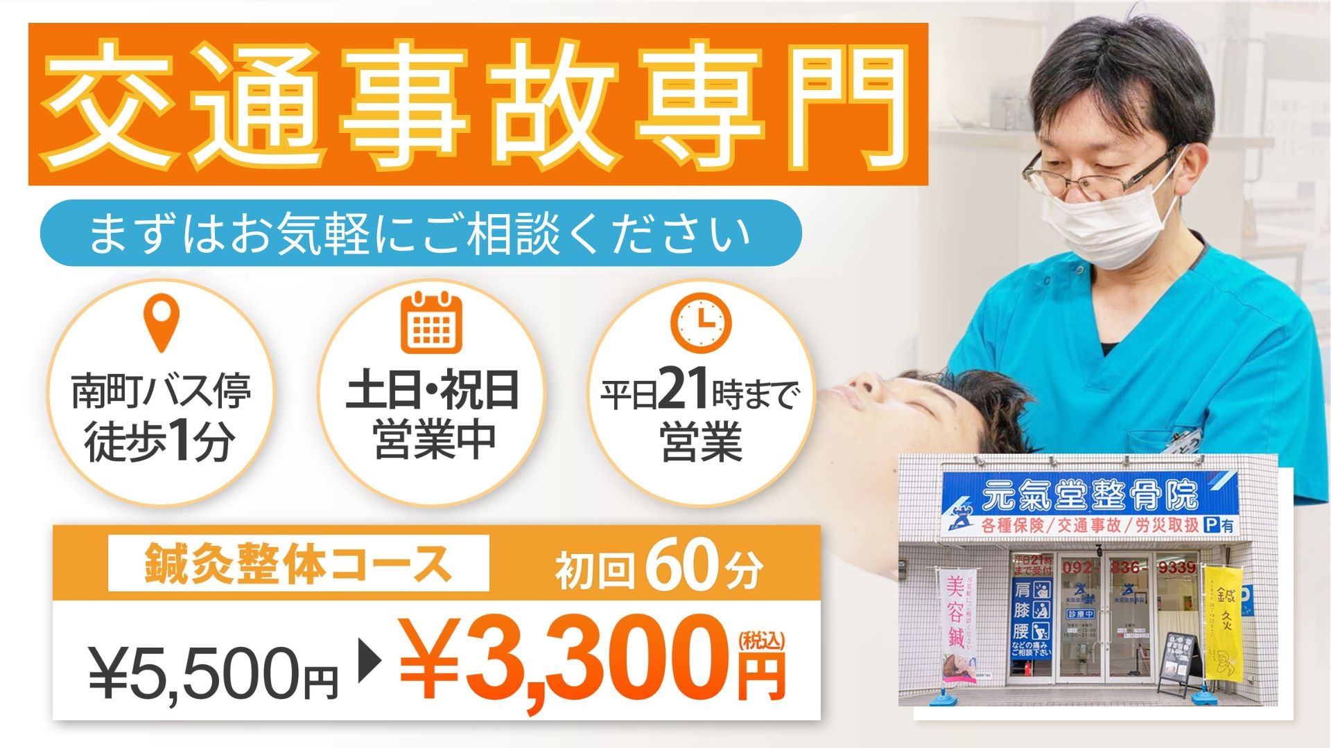 - 元氣堂整骨院へお越し下さい。身体を診させていただき、その症状にあった最善の治療方針を立てます。一人一人の症状に合わせた治療を行い、保険会社へ1カ月ごとに治療経過を報告しながら、治療を進めていきます。